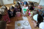 Die Forschergruppe "Der Mensch" hat sich heute mit dem Thema Bewegung beschäftigt. Dazu haben wir nicht nur ein großes Skelett betrachtet, sondern auch Knochenmodelle gebastelt, Tierskelette verglichen und Fuß- und Handabdrücke gemacht. Außerdem wurden schon viele menschliche Skelette hergestellt. Die Kinder haben erforscht, welche Bewegungen mit welchen Gelenken möglich sind - zusammen haben wir über 70 verschiedene Möglichkeiten ausprobiert.